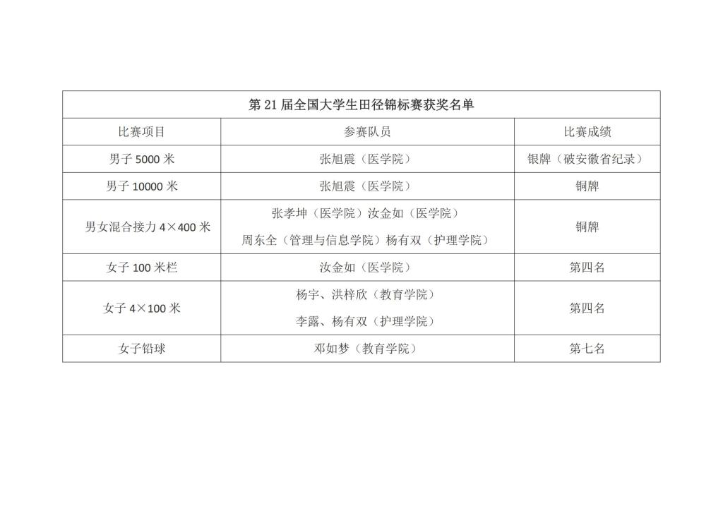 815日晚在经历了6天的激烈角逐后第21届全国大学生田径锦标赛在安徽职业技术学院圆满落幕在本次大赛中,我校派出了由张瑞全、乔黎、许辉等老师为教练,张旭震、周东全、杨有双等10名男女运动员组成的参赛阵容。经过六个比赛日紧张而激烈的角逐,我校代表队最终获得银牌一枚、铜牌两枚、打破省纪录一项、三名同学达到国家二级运动员水平、团体总分42分列全国第七名及女子团体总分第七名的优异成绩。我校田径代表队被大赛组委会授予“体育道德风尚奖”荣誉称号!热烈祝贺!