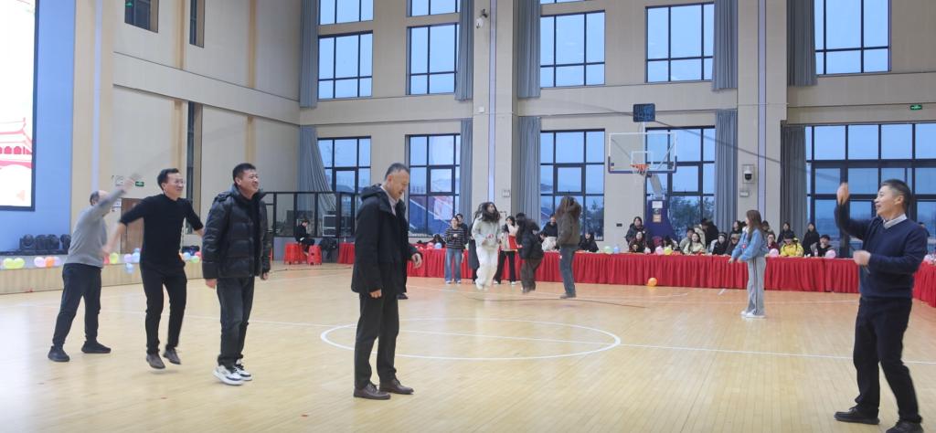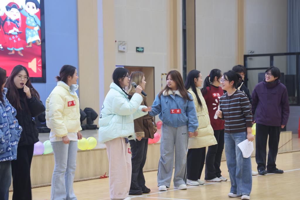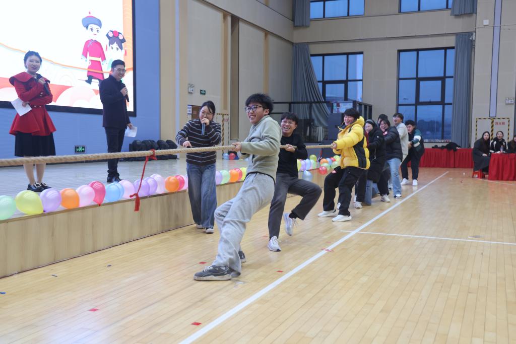 活动在充满民族风情的舞蹈表演中拉开序幕,学生们用热情的舞姿展现多民族文化魅力,迅速点燃了全场气氛。随后,师生共同参与了一系列精心设计的趣味项目。“蒙眼转圈喂食物”考验信任与默契,“知识问答大挑战”普及民族文化与政策常识,“三人四足协作赛”“背对背夹球接力”展现团队协作力量,“拔河比赛”尽显奋进拼搏风采,“你演我猜”“猜曲唱歌”则让现场笑声不断、互动频频。