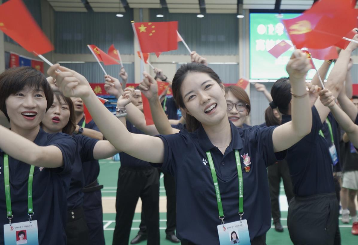 随着《我和我的祖国》优美旋律响起,参与活动的人员分成两支队伍相迎走来汇合在一起,他们手中挥舞着五星红旗,歌声在赛场上此起彼伏,令人心潮澎湃、斗志昂扬。