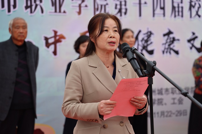 吴惠珍在致辞中指出,举办中医药健康文化推广活动是学校贯彻落实习近平文化思想,展现中医药文化精髓,促进中医药文化传承创新发展的生动实践,也是落实立德树人根本任务,发挥“杏林精神”“大医精诚”等传统中医药精神蕴含的铸魂育人独特文化价值,更是营造校园特色文化,培养德智体美劳全面发展的社会主义建设者和接班人的重要举措。