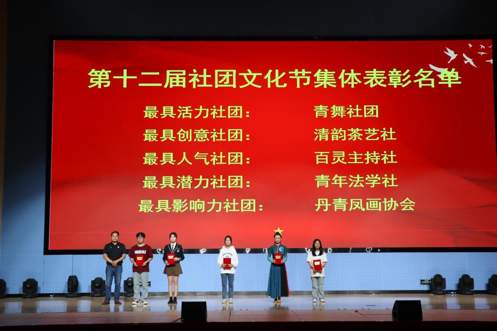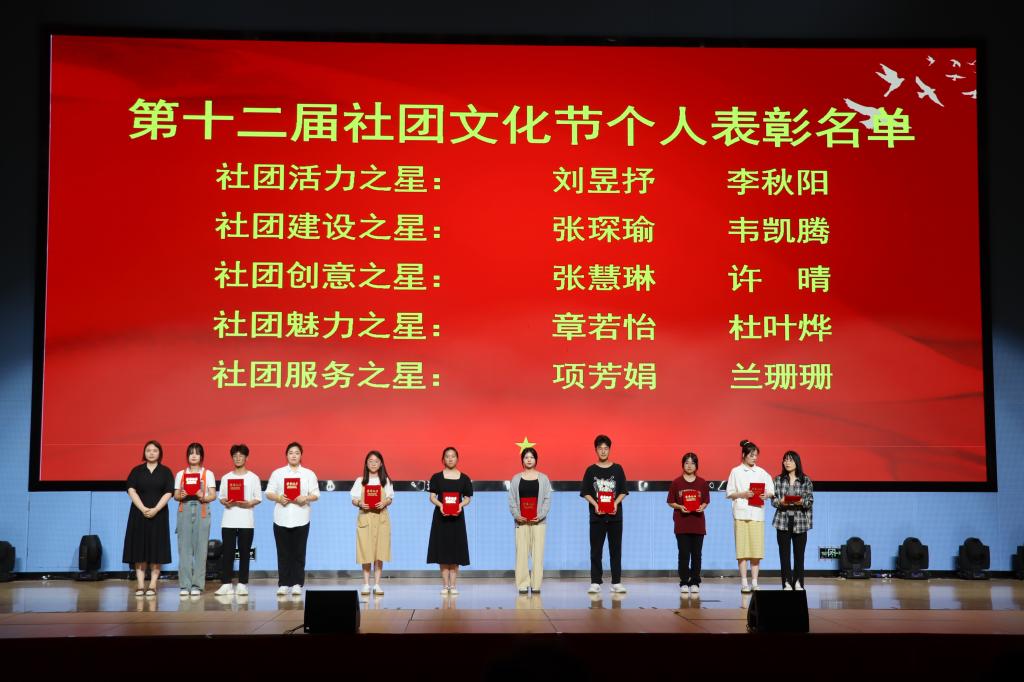 随后,主持人宣读第十二届社团文化节中积极参与活动的先进个人和集体,陈婷婷、刘亮依次为获得表彰的学生代表颁奖。