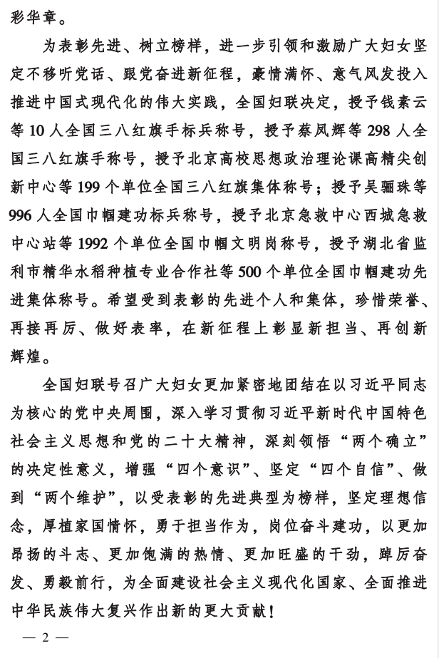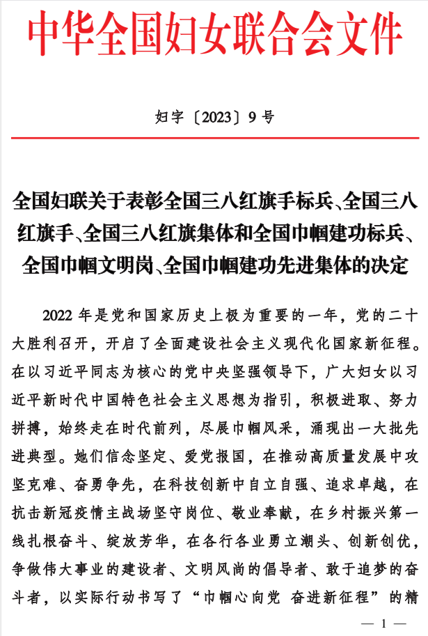 为表彰先进、树立榜样, 进一步引领和激励广大妇女坚定不移听党话、跟党奋进新征程。近日,全国妇联公布了《全国妇联关于表彰全国三八红旗手标兵、全国三八红旗手、全国三八红旗集体和全国巾帼文明岗、全国巾帼建功标兵、全国巾帼建功先进集体的决定》,我校团委被全国妇联授予“全国巾帼文明岗”称号。热烈祝贺!