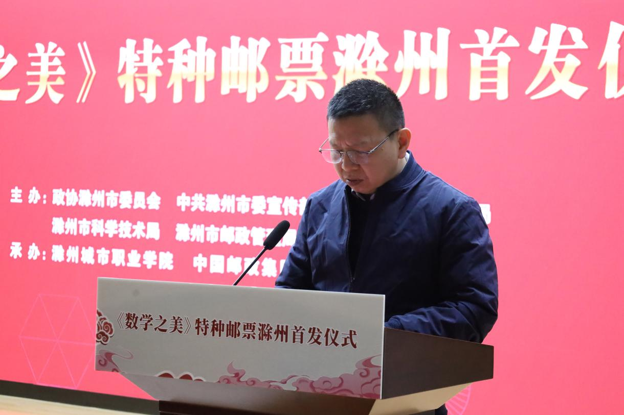 万顷向大家介绍了首发邮票的主题内容,并表达了滁州邮政与我校携手共绘“数学之美”的情怀与深意。万顷指出,通过邮票这一“同心结”,链接了邮政“传启文明”与我校“修德立身,精技立业”的育人使命。他希望未来与我校继续携手,加强校企合作,让更多“数学之美”走出课堂、飞入寻常百姓家,激发更多人对科学技术的兴趣与热爱,为培养科技创新人才贡献邮政力量。