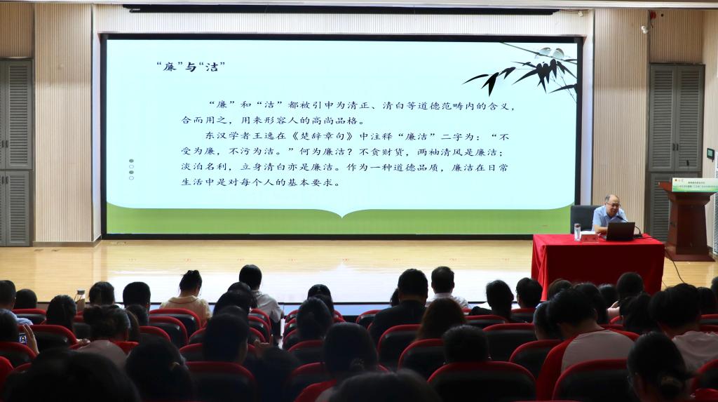 池鹏以《廉心若水润无声清风盈怀尘不染——浅谈廉洁文化与作风建设》为题,围绕“理想信念强基固本”“文化滋养培根铸魂”“品格锤炼修身正己”三个维度展开讲授。他立足理论高度,深刻阐释理想信念对党员干部和青年成长的引领作用,并结合中华优秀传统文化、社会主义先进文化、革命文化的精神内核,剖析廉洁文化的历史渊源与时代价值,聚焦“明大德、守公德、严私德”实践要求,系统讲解党员干部、新时代青年应具备的道德品格与行为规范,为参会人员带来了一堂兼具思想深度与教育温度的廉政教育专题党课。