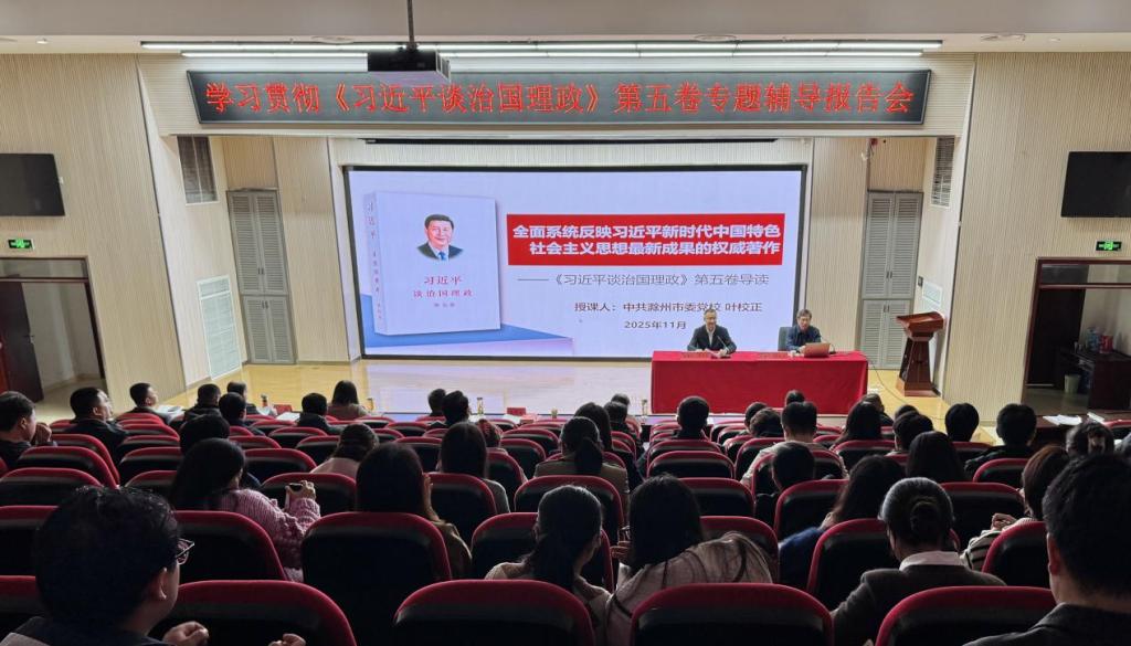 会议邀请市委党校副校长叶校正作《习近平谈治国理政》第五卷导读专题辅导,叶教授系统阐释了《习近平谈治国理政》第五卷的时代背景、重大意义、逻辑框架与核心要义。报告既有对“两个结合”“中国式现代化”等重大理论创新的深刻解读,又结合高质量发展、新质生产力、教育科技人才等具体部署展开生动剖析,对于我校师生深化理论武装、把握时代脉搏、落实立德树人根本任务具有重要的方向指引价值和实践指导意义。