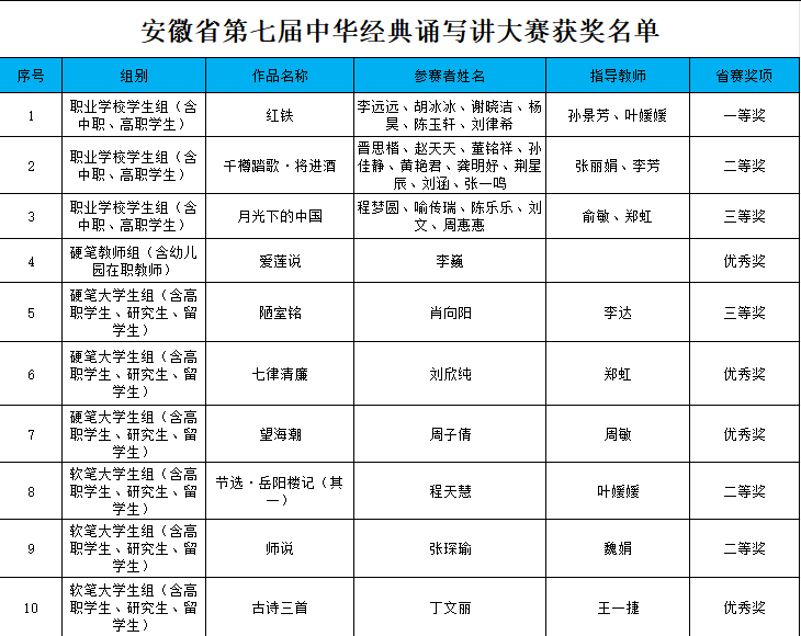 日前,第七届中华经典诵写讲大赛安徽省预选赛评选结果揭晓,我校师生表现优异,斩获多项荣誉,学校首次获评优秀组织奖。