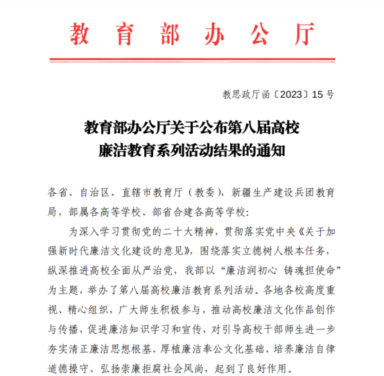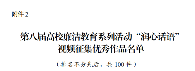本次活动,校纪委办按照《教育部办公厅关于举办第八届高校廉洁教育系列活动的通知》要求,分别组织“廉心文语”征文,“润心话语”视频,“清心妙语”创意三类作品参赛,并对应确定指导教师,精心组织,策划指导。从今年5月起,在全校范围内征集作品,共征集视频作品7部,征文作品5篇,设计作品1副。经过评选,上报视频作品1部,征文作品1篇,设计作品1副,最终视频作品《青年·清廉》被评为优秀作品(不设等次),安徽省高校共有17所高校获奖,其中高职院校仅5所。