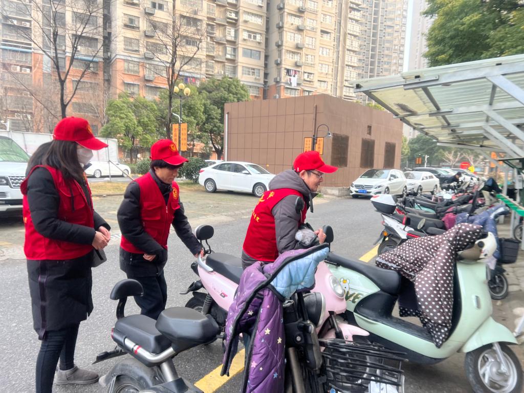 学校机关第二党支部联合台盟滁州支部深入丰乐社区开展志愿服务活动,志愿者们身穿红马甲,开展安全防范宣传,提醒居民严禁在走廊、楼梯间、安全出口等公共区域停放电动车或充电,不在房屋内停放电动车或充电。