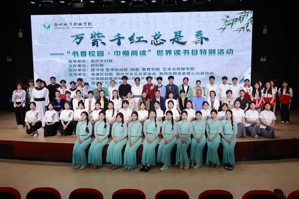活动围绕“书香校园 巾帼阅读”主题,通过经典诵读、读书分享、阅读访谈、图书惠民等形式,展现女性阅读的力量。其中“她力量 书时光”访谈节目成为亮点,嘉宾刘星悦担任了访谈节目的主持人,三位来自不同领域的优秀女性代表围绕读书感悟与女性成长展开深度对话,结合自身经历,分享了阅读对职业发展和人生境界的深远影响,展现了知识如何塑造女性多元角色,也为校园阅读推广提供了鲜活的榜样案例。滁州市朗读者爱心公益协会的诗朗诵《英雄》铿锵有力、震撼人心,滁州市女企业家协会选送的节目《醉翁亭的月》温婉清新、令人陶醉,南谯区妇联带来的舞蹈《九州同》更是让观众领略了古典舞的魅力,我校获得安徽省教学能力大赛一等奖的叶洪珍教授声情并茂的分享了《最美四月天 正是读书时》引起了现场观众的强烈共鸣。活动最后,全场观众起立一起宣读了《女性终身阅读倡议书》,将整场活动推向了高潮。