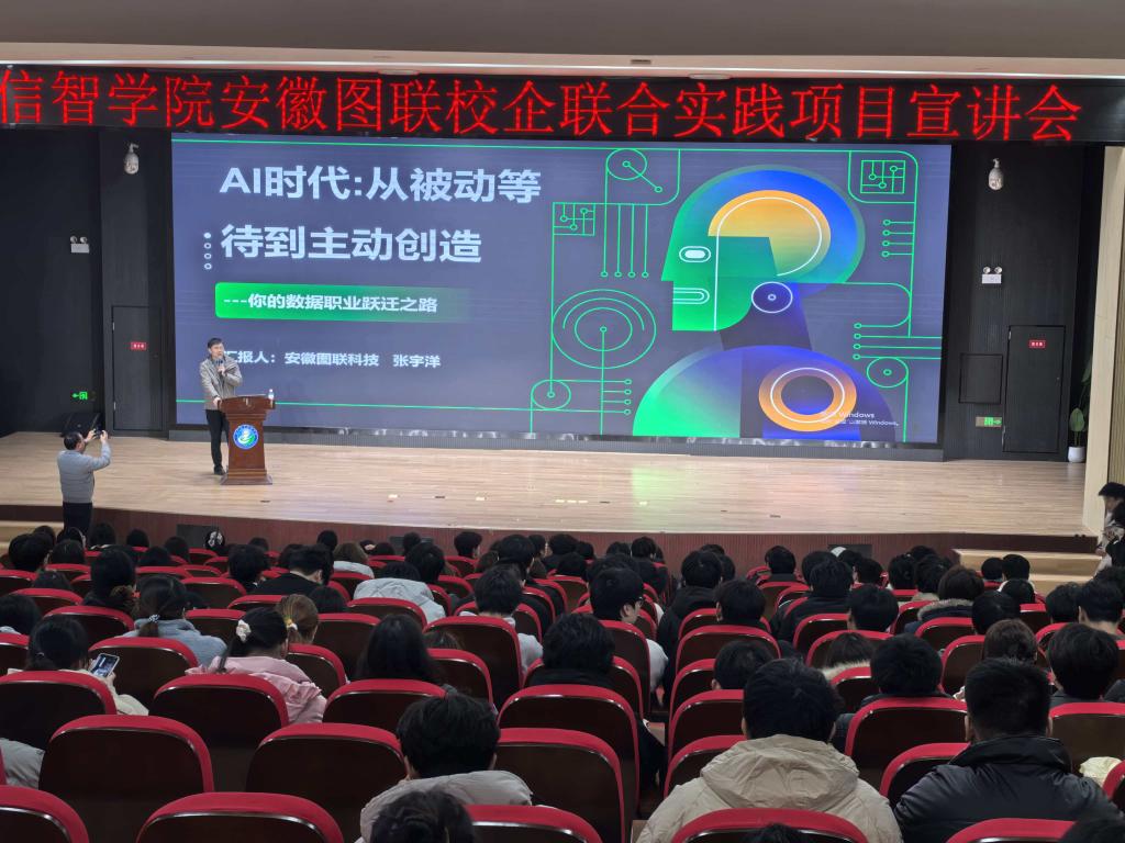 为深入贯彻落实高校毕业生就业工作决策部署,帮助学生明晰职业发展方向、提升就业竞争力,深化产教融合、搭建校企协同育人平台,3月10日,现代信息与人工智能学院成功举办“信智大讲堂”之职业规划指导暨与安徽图联科技有限公司校企联合实践项目宣讲会。学院相关负责人、专业教师、安徽图联企业代表及24级全体学生参加本次活动,活动由学院办公室统筹主持。
