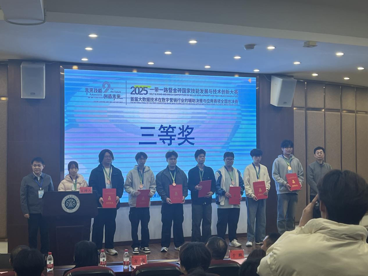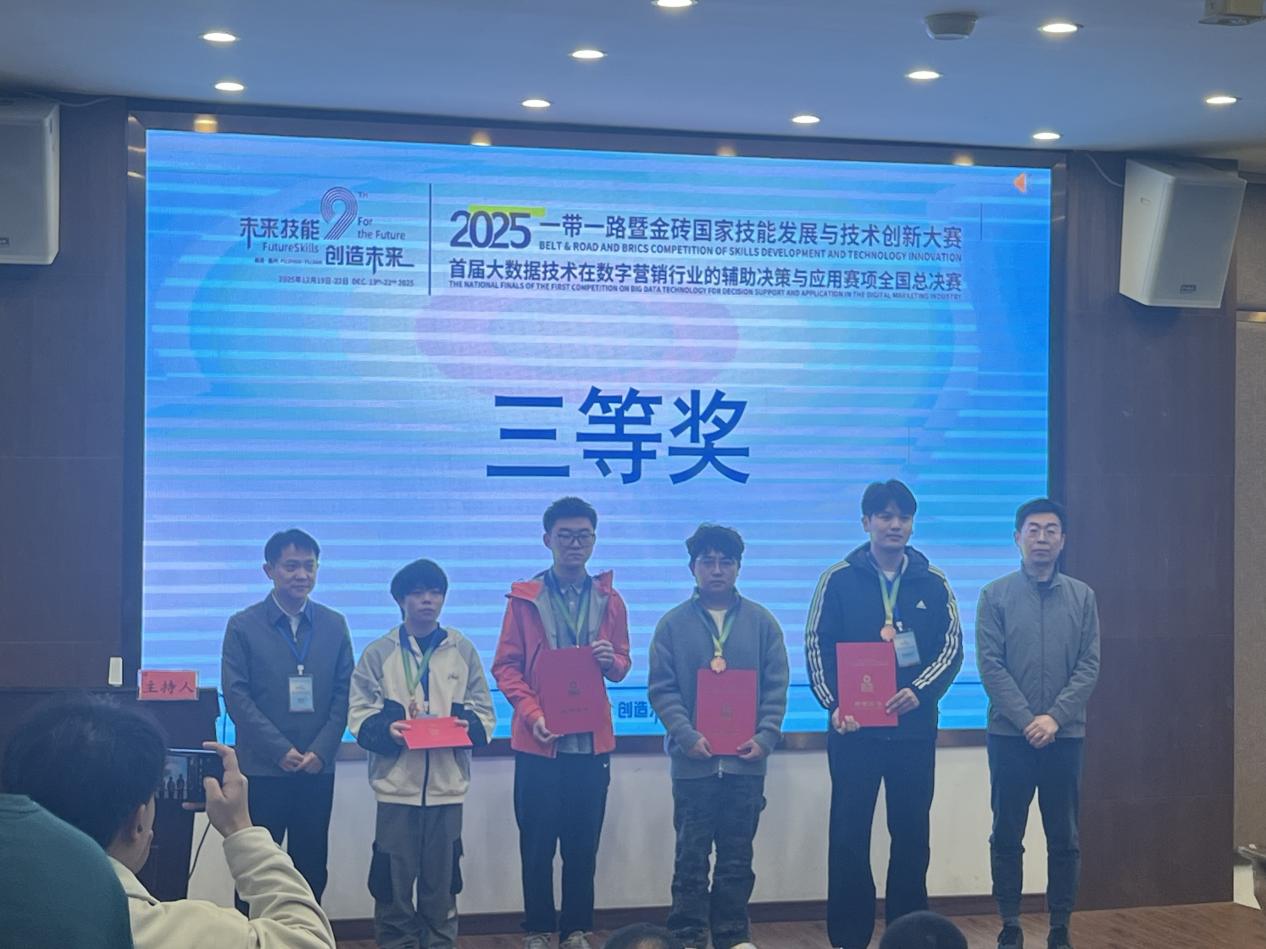 12月21日,在“2025一带一路暨金砖国家技能发展与技术创新大赛”首届“大数据技术在数字营销行业的辅助决策与应用”赛项全国总决赛中,现代信息与人工智能学院的许国强与闪仁杰两位同学,凭借扎实的专业技能、创新的解决方案和出色的临场发挥,从众多参赛队伍中脱颖而出,荣获全国总决赛三等奖。这一成绩不仅为学校赢得了荣誉,更标志着该校在该高水平技能竞赛领域实现了历史性的突破。