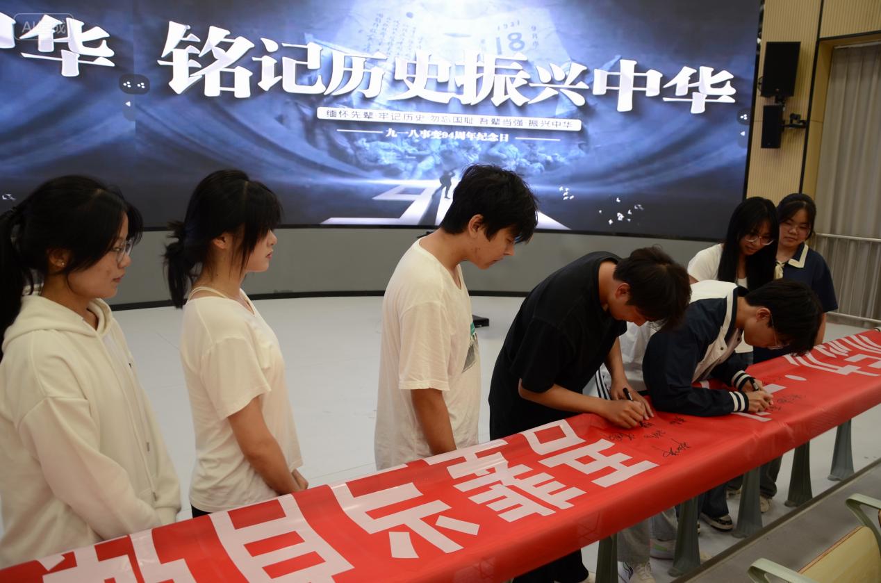 默哀仪式后,签字立志环节拉开序幕。工作人员展开主题条幅,学生们有序上前,用黑色签字笔郑重签下自己的名字,以笔墨立下“勿忘历史、自强奋进”的青春誓言。