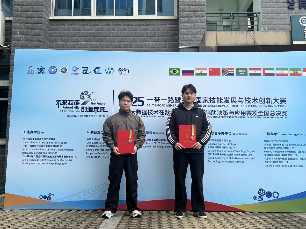 12月21日,在“2025一带一路暨金砖国家技能发展与技术创新大赛”首届“大数据技术在数字营销行业的辅助决策与应用”赛项全国总决赛中,现代信息与人工智能学院的许国强与闪仁杰两位同学,凭借扎实的专业技能、创新的解决方案和出色的临场发挥,从众多参赛队伍中脱颖而出,荣获全国总决赛三等奖。这一成绩不仅为学校赢得了荣誉,更标志着该校在该高水平技能竞赛领域实现了历史性的突破。