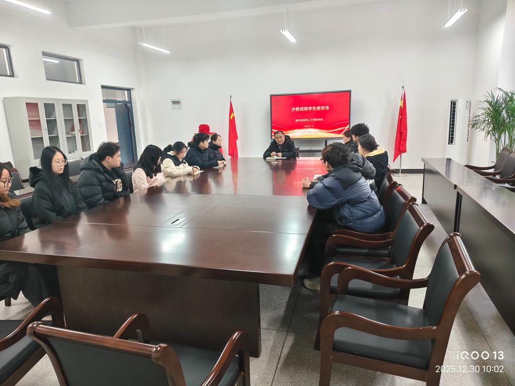 为深入贯彻落实民族团结进步教育要求,铸牢中华民族共同体意识,切实关心关爱少数民族学生成长成才,搭建师生沟通的坚实桥梁,11月4日,现代信息与人工智能学院在党员活动室召开少数民族学生座谈会。学院党总支书记卢齐伟、团总支书记王校怡及全院少数民族学生齐聚一堂,共话校园生活,共商成长大计,现场氛围温馨而热烈。