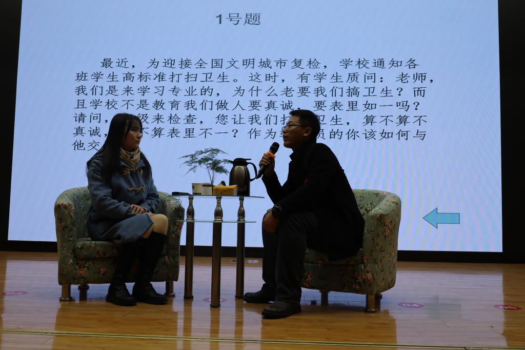 整场比赛分基础知识测试、案例研讨、谈心谈话三个环节。早上八点基础知识测试开始,比赛正式拉开帷幕。在“案例研讨”环节,参赛辅导员们围绕案例,对问题本质、解决思路、实施办法及相关启示进行了详实的阐述,展示了我院辅导员们的工作魅力和风采;在“谈心谈话”环节,针对学生中出现的违规电器使用、学生资助以及劳动教育等问题,参赛辅导员们结合自己的工作经验,循循善诱、晓之以理、动之以情,巧妙地给学生进行各种心理疏导,让看似严肃的六分钟谈话变成了师生交流的别样舞台。