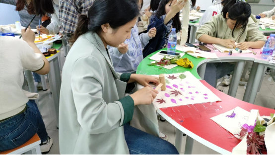 同学们利用亲手采集的各种树叶,展开丰富的想象力,在布袋上绘制自己专属的独一无二的图案,DIY一个满满心意的手工包包。活动中,同学们聚精会神、专心致志的创作,不仅将自己眼中的美好淋漓尽致地表现在作品中,同时也展现了创作者丰富多彩的内心世界。让同学们在学习之余放松心情,缓解压力。