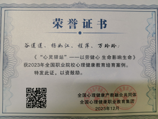 另外,12月6日-9日,“全国心理健康职业教育发展峰会暨全国心理健康产教融合共同体(全国心理健康职业教育集团)”成立大会在河南省南阳市召开。本次会议的主题是“健康发展共享赋能”。来自全国17个省市80余个成员单位参会,与会专家围绕大会主题各抒己见,分享心理健康教育的做法和经验,并对各单位选送的工作案例进行评选,我校选送的《“心灵驿站”--以劳健心 生命影响生命》案例,荣获2023年全国职业院校心理健康教育培育案例。