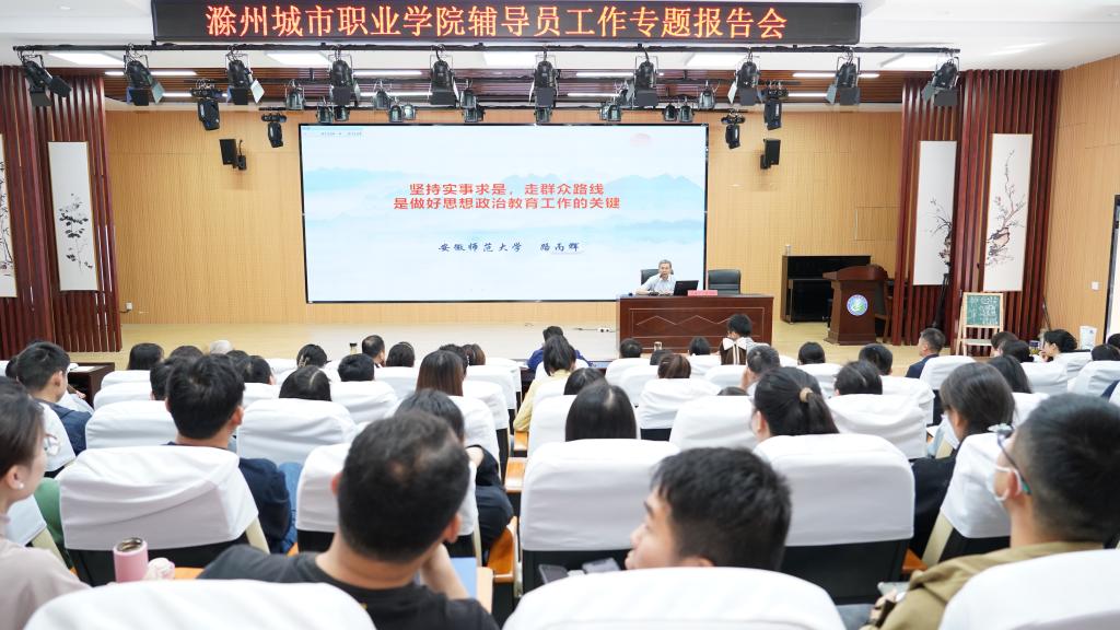 为深入学习贯彻习近平总书记关于教育的重要论述,落实立德树人根本任务,进一步加强辅导员队伍建设,5月14日上午,全国最美思政课教师、安徽师范大学马克思主义学院博士生导师路丙辉教授应邀来我校为全体辅导员作了题为《坚持实事求是,走群众路线是做好思政教育工作的关键》的专题讲座,讲座由校党委委员、学生处处长杨如江主持。各二级学院党总支副书记、全体专兼职辅导员160余人现场聆听了讲座。