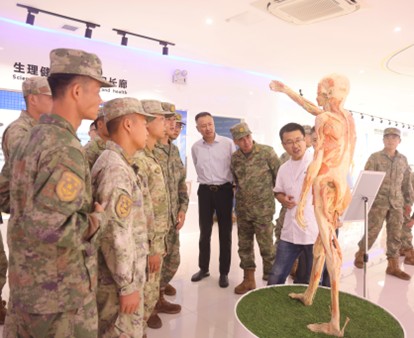 在茶艺技能大师工作室,师生现场展示了茶叶品鉴等技艺,军训官兵在行云流水的冲泡流程中感受传统文化的魅力;中医康复实训室里,教师通过现场示范与互动体验,让军训官兵直观了解中医康复技术的实用价值;生命科学馆内,教官们直观感受到生命科学的严谨与神奇;凤画技艺大师工作室内,凤画的绘制技艺和滁州文化主题文创产品让军训官兵眼前一亮,军训官兵深刻感受到了滁州地域文化的独特之处,对学校将理论知识与实物教学结合的模式表示认可。