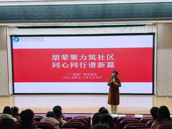 活动伊始,田青青全面回顾了2025年学校“一站式”学生社区建设的亮眼成绩单。她指出,过去一年,依托学校“1236”建设机制和“4e”社区理念,在各学生组织的积极参与和全力配合下,社区在学生自治、服务保障、文化建设等方面取得了阶段性成效,强调学生骨干们在新一年的工作中,要持续强化“自我管理、自我服务、自我监督”的“三自”理念,充分发挥主体作用,让社区服务更贴合学生需求、更具温度实效,推动社区建设提质增效。