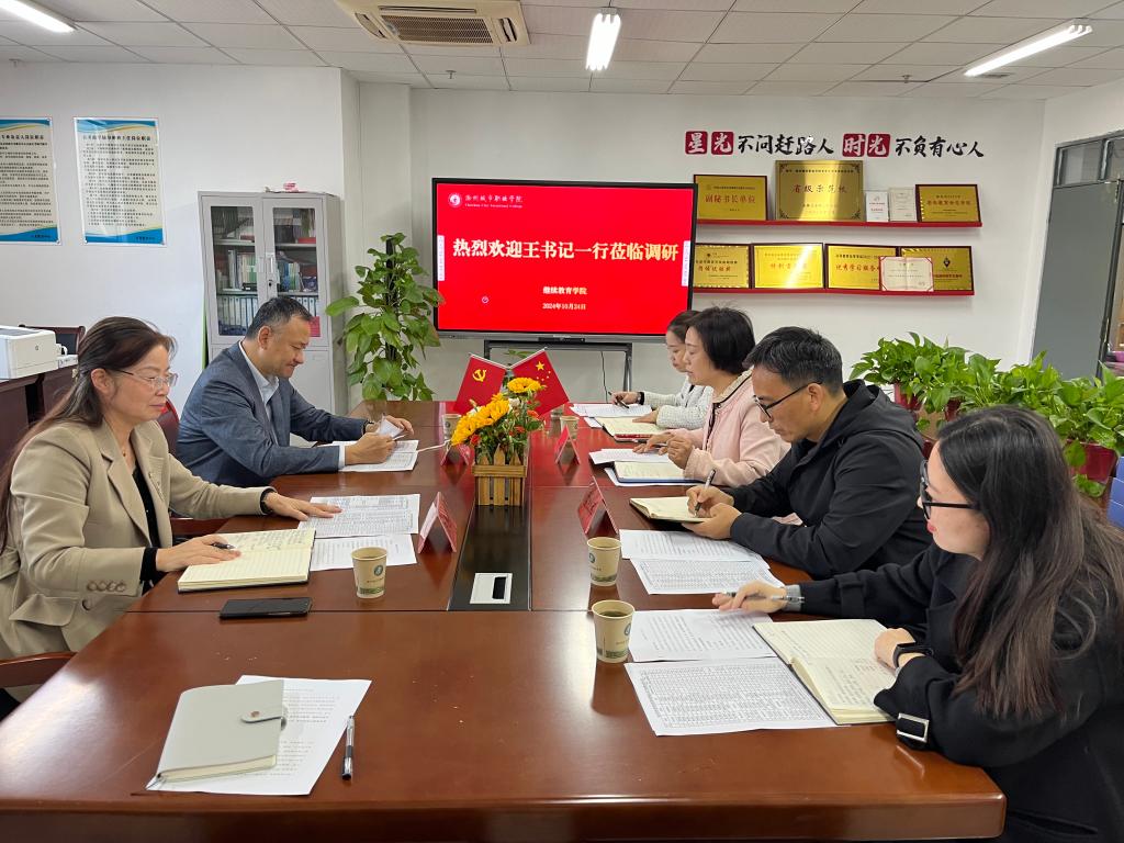 10月24日上午,校党委书记王燕永,党委委员、副校长吴惠珍深入继续教育学院调研指导工作,继续教育学院院长许梅、副院长孟红军及全体工作人员参加调研。调研座谈会上,许梅就成人教育、自学考试、社会培训与技能认定、老年大学、国际交流合作、专升本等工作情况进行了汇报,与会人员结合自身工作情况进行交流发言。王燕永对继续教育学院成立以来各项工作取得的成果给予了充分肯定,对存在的问题与参会人员进行了广泛的交流。王燕...