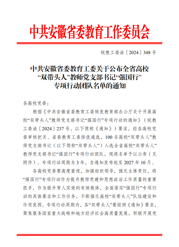 近日,中共安徽省委教育工委公布了全省高校“双带头人”教师党支部书记“强国行”专项行动团队名单,我校护理学院教工党支部成功入选。中共安徽省委教育工委组织开展的“强国行”专项行动计划,旨在落实立德树人根本任务,充分发挥高校“双带头人”示范引领作用,通过开展党建联建、教育服务、科技赋能、实践育人等方式,推进教育、科技、人才“三位一体”协同融合发展。多年来,我校高度重视党建工作,不断增强院(部)党组织...