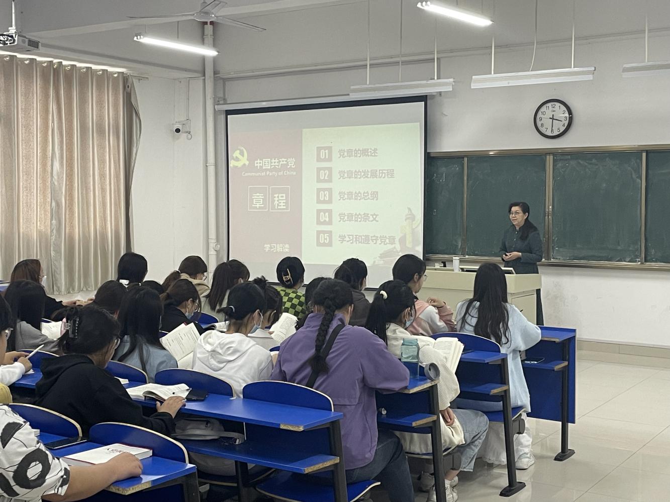 牛书记分别从党章的概述、党章的发展历程、党章的总纲、党章的条文、学习和遵守党章等五个方面,详细解读了2017年党的十九大通过的《中国共产党章程》,带领大家全面回顾了党章的发展史,党的性质和行动指南,申请入党的条件,以及党章对于党员的要求等内容。她要求全体党员和入党积极分子,要积极学党章、强党性、践誓言,从党章变化中深刻领悟中国共产党不忘初心、牢记使命的精神和与时俱进的魄力。并寄予青年学生殷切的希望。
