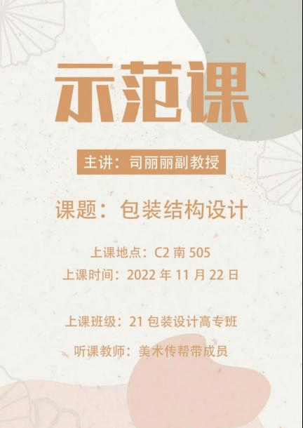 为提升新教师的教育教学能力,发挥老教师的模范带头作用,落实传帮带工作目标。11月22日下午美术传帮带团队司丽丽副教授,在C2南505教室以《包装结构设计》为题,为青年教师示范授课。