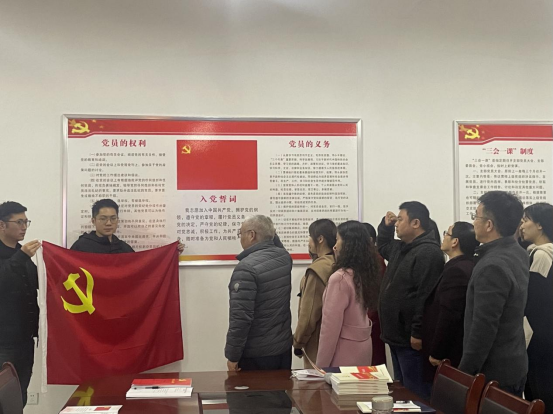 接着活动进入“重温入党誓词”环节,在学生党支部书记汪勇的领誓下,全体支部成员面对党旗,举起右拳,重温入党誓词,宣誓声响铿锵有力。在真切的宣誓词中,全体党员进一步增强了党员意识,坚定了理想信念,接受了思想和精神上的深刻洗礼。