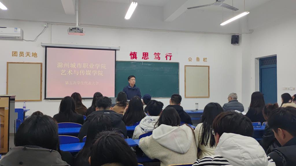 为了选优配强学生会干部,提升学生服务水平,11月29日,艺术与传媒学院第五次学生代表大会在C4-132教室顺利召开,第四届学生会主席团代表和59名各班级学生代表参加了本次会议。大会由艺术与传媒学院团总支书记周桐羽主持。艺术与传媒学院党总支书记杨孝富、副书记汪勇出席会议。