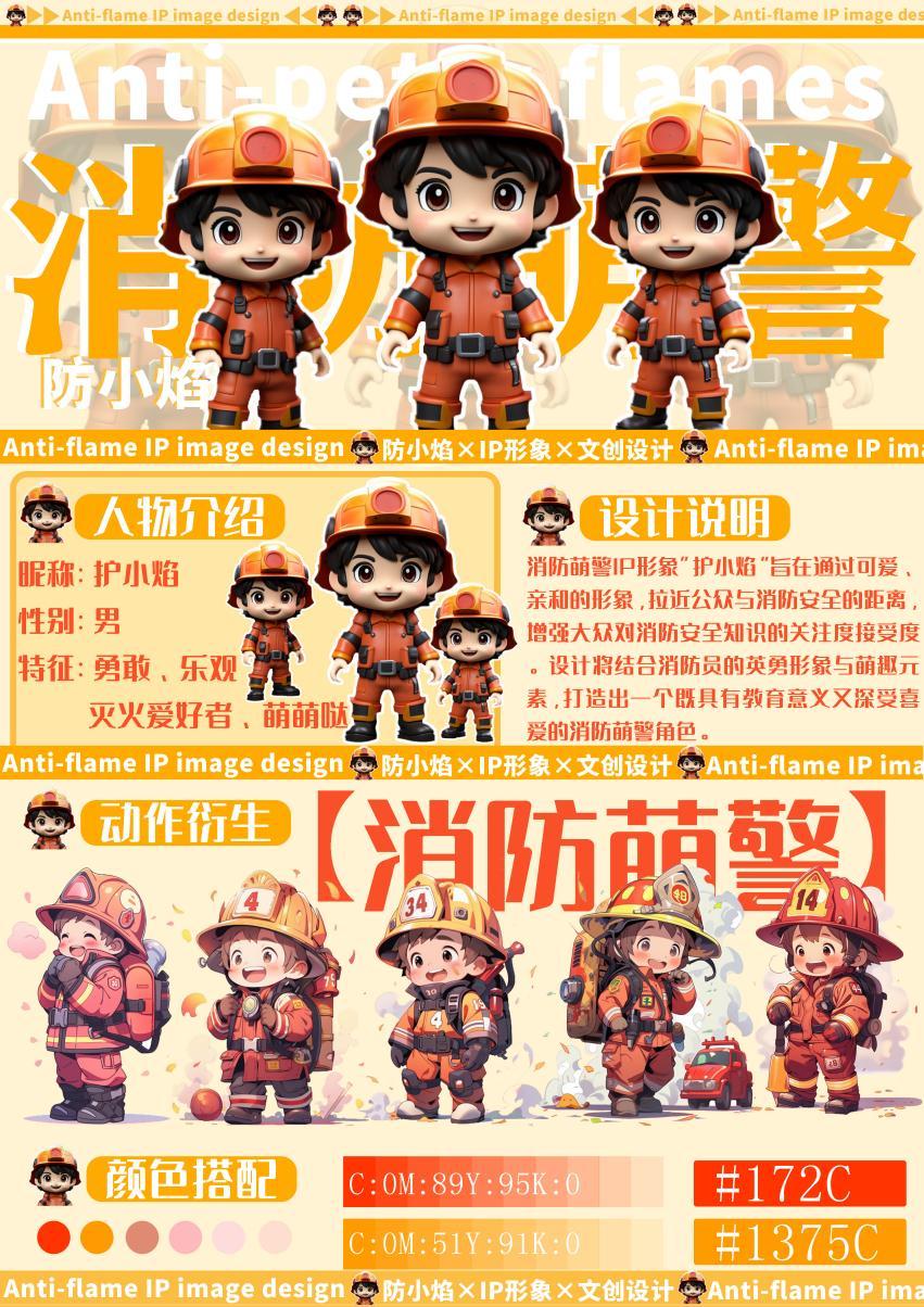 李菲、熊欣桐老师指导的学生束俊宽、吴涵、刘小宇、胡世俊团队的作品《消防萌警“护小焰”IP文创衍生设计》荣获了二等奖。这部作品巧妙地将消防元素与萌系文化相结合,设计出了一系列既可爱又实用的文创产品,不仅展现了学生们丰富的想象力和创造力,也体现了他们对消防安全的深刻理解和关注。