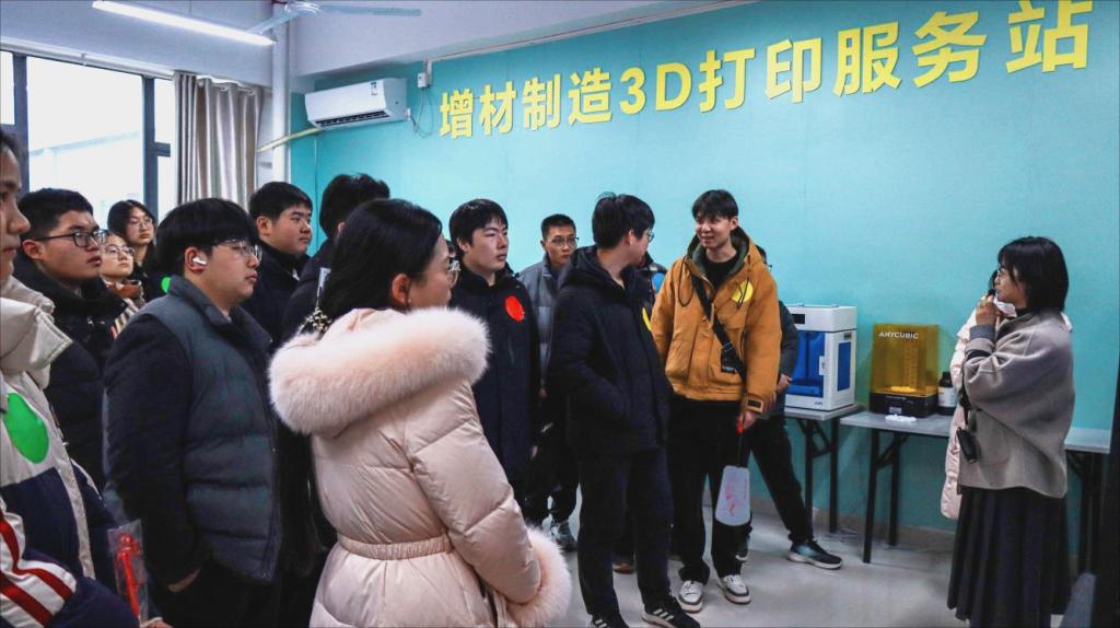 随后,学子们参观了工作室核心展示区域的3D打印设备。作为学院实践教学与创新研发的重要阵地,这里配备多台先进3D打印设备,涵盖FDM(熔融层积成型)、光固化(SLA)等主流技术,可满足文创开发、模型制作、产品设计等多场景教学与实践需求。现场,师生团队细致演示了从数字建模、参数调试到逐层打印的完整流程,让学子们直观感受智能制造的科技质感。