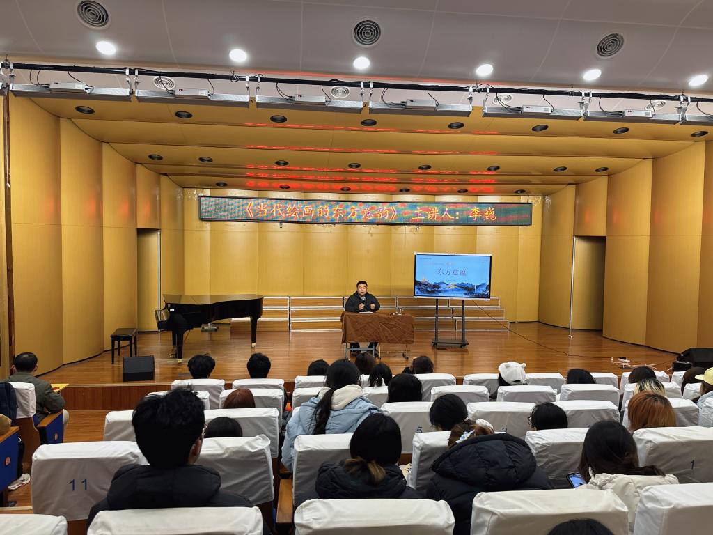 为传承中华优秀传统文化,弘扬中华美学精神,12月1日下午4点30分,艺术与传媒学院在音乐厅举办“当代绘画的东方意蕴”专题讲座。本次讲座由美术系副教授李巍主讲,美术专业师生及绘画爱好者共同参与。