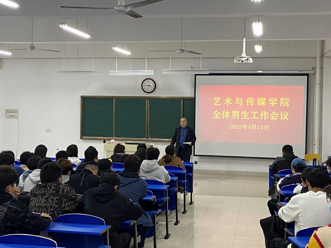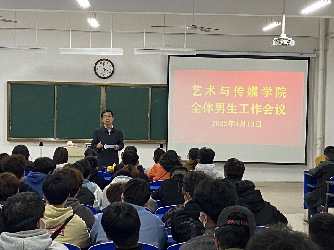 疫情防控期间,为了加强学生纪律教育,筑牢防疫安全底线,艺术与传媒学院于4月13日下午在c1北1103教室开展了全体男生工作会议。学院党总支书记杨孝富、党总支副书记汪勇、学管秘书李巍和学院全体在校班级辅导员(班主任)、学院全体男生参加了此次会议。