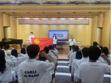 首先,该班级团员代表邹可进行演讲,她表示青年团员应该努力学习,报效祖国,用实际行动书写强国之梦。随后,邹可带领着参会人员奏唱团歌。
