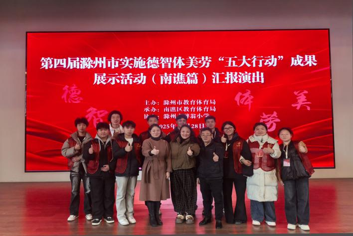 2025年11月28日下午,滁州市第四届实施德智体美劳五大行动成果展示活动(南谯区)汇报演出在滁州市醉翁小学绚丽启幕。艺术与传媒学院“艺+1”青年志愿队在音乐系主任霍雪娇和副主任潘瑶的带领下,参与了汇报演出的志愿活动。这场演出宛如一场璀璨的盛宴,全方位、多角度地展现了德智体美劳五大行动在南谯区结出的累累硕果,引得现场观众连连赞叹。