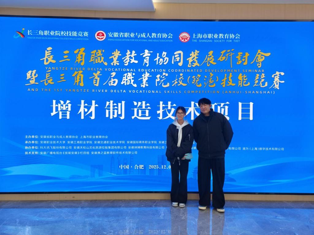12月7日长三角地区职业院校能力大赛“增材制造”赛项圆满落幕。滁州城市职业学院艺术与传媒学院学子崔诗宇、沈传乐在樊瑾老师带领下,凭借扎实的专业功底与默契协作,从多所参赛院校队伍中脱颖而出,成功斩获三等奖,展现了学院学子优良的专业素养与竞技风采。