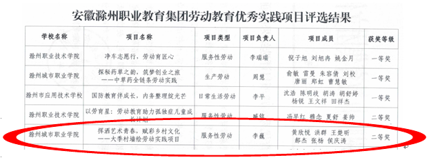李巍老师指导的学生团队黄欣悦、洪群、王楚昕、郝杰、张扬、候庆涛的劳动实践项目《挥洒艺术青春,赋彩乡村文化—大季村墙绘劳动实践》在滁州职业教育集团优秀劳动教育教育实践项目评选汇总喜获二等奖。