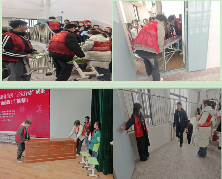 2025年11月28日下午,滁州市第四届实施德智体美劳五大行动成果展示活动(南谯区)汇报演出在滁州市醉翁小学绚丽启幕。艺术与传媒学院“艺+1”青年志愿队在音乐系主任霍雪娇和副主任潘瑶的带领下,参与了汇报演出的志愿活动。这场演出宛如一场璀璨的盛宴,全方位、多角度地展现了德智体美劳五大行动在南谯区结出的累累硕果,引得现场观众连连赞叹。