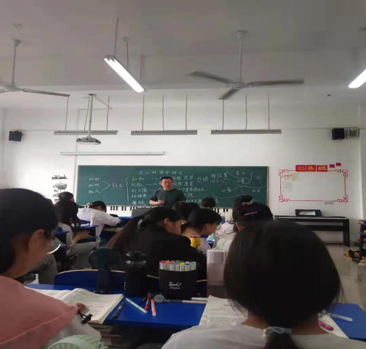 5月25日第六节课,吕盛同志在19学前教育初专5班上公开课,课题为《永遇乐·京口北固亭怀古》,吕盛同志从词中的典故讲起,引导学生用“诗言志,词传情”“诗心显,词心隐”规律,欣赏这首词用典妙处。课堂教学氛围活跃,学生学习积极性很高。
