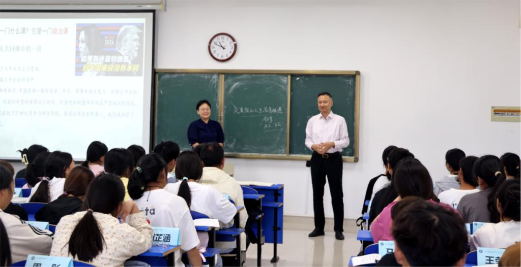 王燕永与汪上分别走进班级与新生们共同聆听第一节思想政治理论课。