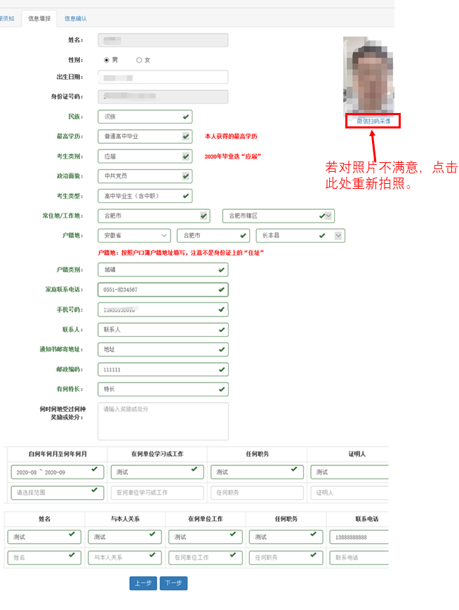 根据本人情况,依次选择或填写报名信息,填写完毕仔细检查,无误后点击“下一步”进入信息核对页面。