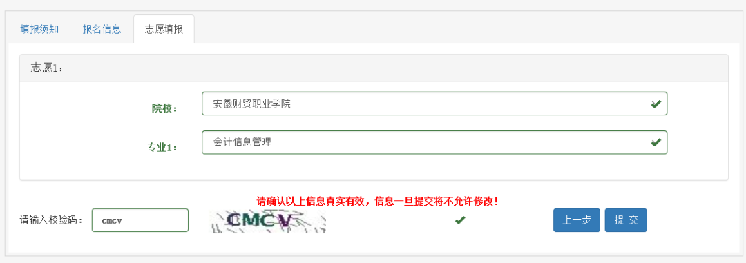 报名信息填写完毕后,请再次核对本人所填信息是否有误,若有更改,请点击“上一步”,进入填报页面进行修改。确认无误后,填写页面下方的验证码,并点击“提交”按钮提交信息。信息一旦提交,任何人不得修改!
