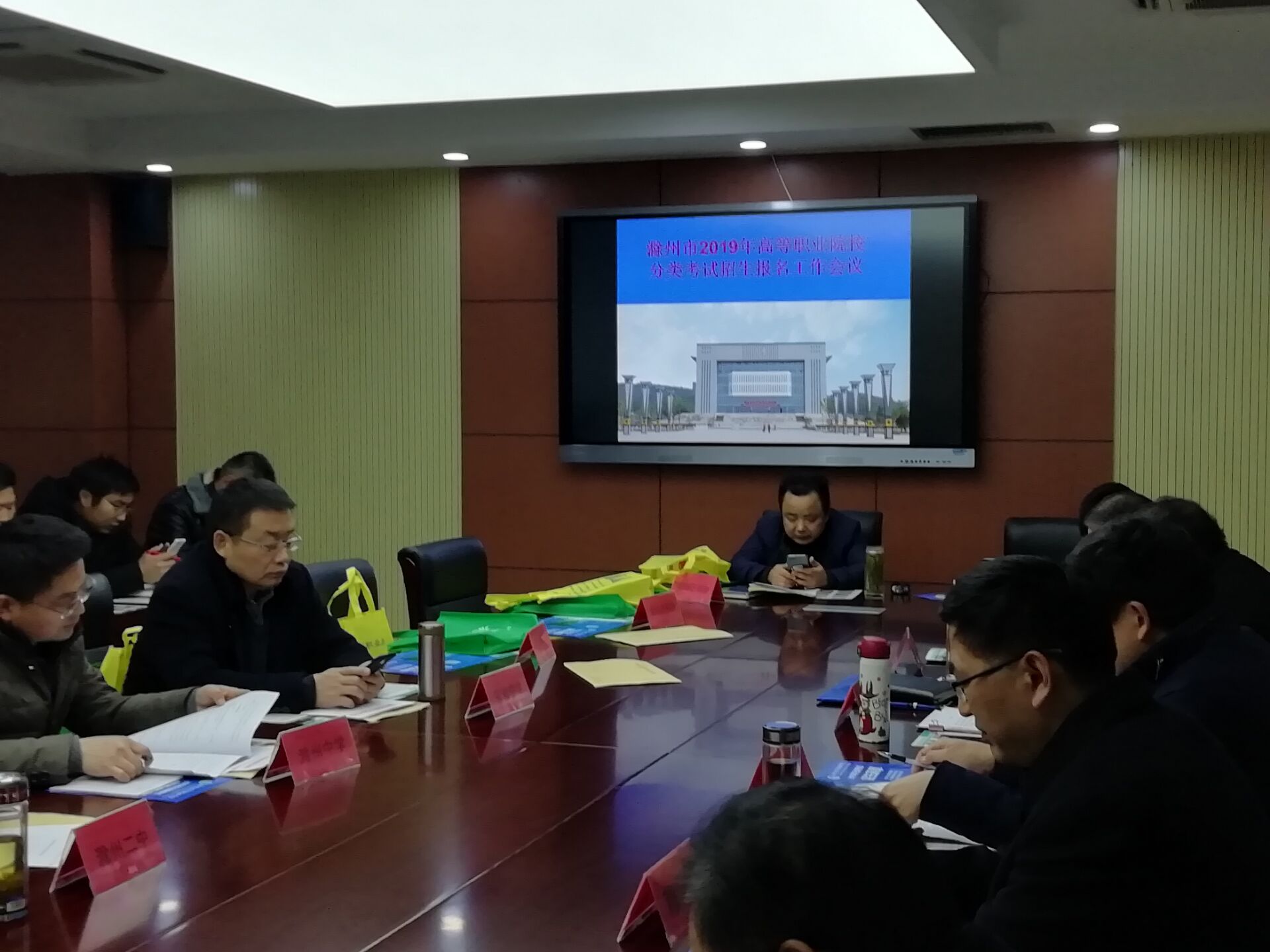 2月26日,滁州市2019年高等职业院校分类考试招生报名工作会议在我院召开,会议由市教体局招生办主任陈敬岳主持,六县二区招生考试机构负责人、市区生源学校分管主任等参加了会议。