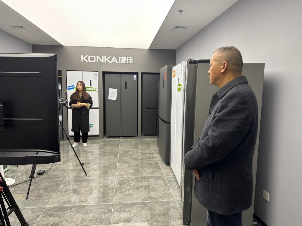 在康佳白电直播基地,施向阳一行实地考察基地直播间建设情况,详细了解运行情况、产业布局、平台体系、产能产值、市场行情等情况,并就人才需求、业务流程、用工保障等方面等进行深入交流。