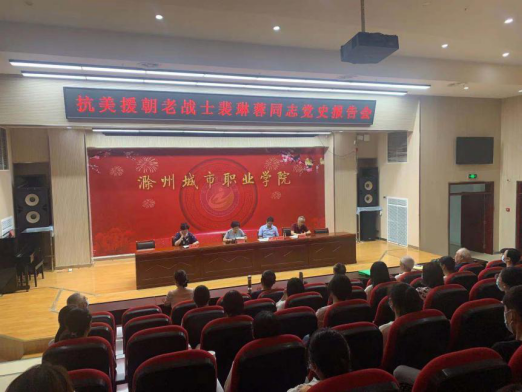 为庆祝中国共产党成立100周年,推动党史、国史、改革开放史、社会主义发展史学习入脑入心,6月7日下午,学院退休职工、原滁州艺校副校长、抗美援朝老战士裴琳蓉同志在图文中心学术报告厅为广大师生做党史报告。学院相关部门负责人,关工委成员、离退休第一支部部分党员、各系部学生入党积极分子共120余人参加了此次报告会。报告会由党委委员、组织人事处处长徐云川主持。