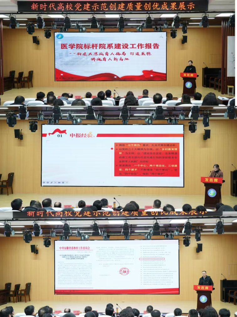 述职评议后,医学院省级标杆院系、教育学院省级样板支部、护理学院省级“双带头人”强国行团队聚焦申报经验、特色亮点、具体措施、突出成效方面进行成果展示,内容精彩纷呈,形式丰富多样,经验提炼精准,对我校进一步提升新时代高校党建示范创建、质量创优工作具有示范引领作用。各级党组织班子成员进行观摩学习,视野得到进一步开拓,精气神得到进一步提升。