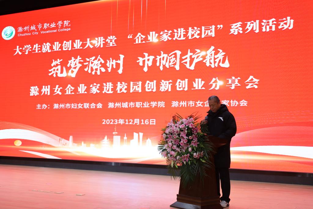 为更好助推学生就业创业,促进学生成长成才,充分发挥女企业家在引领女性创业、助力人才培养上的独特优势,12月16日,学校联合滁州市妇女联合会、滁州市女企业家协会开展“筑梦滁州 巾帼护航”女企业家进校园系列活动,邀请滁州市成功创业家和企业家送就业岗位进校,并为大学生开展创新创业分享。校党委书记张志华出席活动并讲话。党委委员施向阳参加活动并致辞。滁州市妇女联合会党组书记、主席周爱勤,副主席吴晓丽和滁州市女企业家协会近30名会员女企业家参加活动。招生就业处处长朱启来主持分享会,近300名在校大学生聆听了事迹分享。