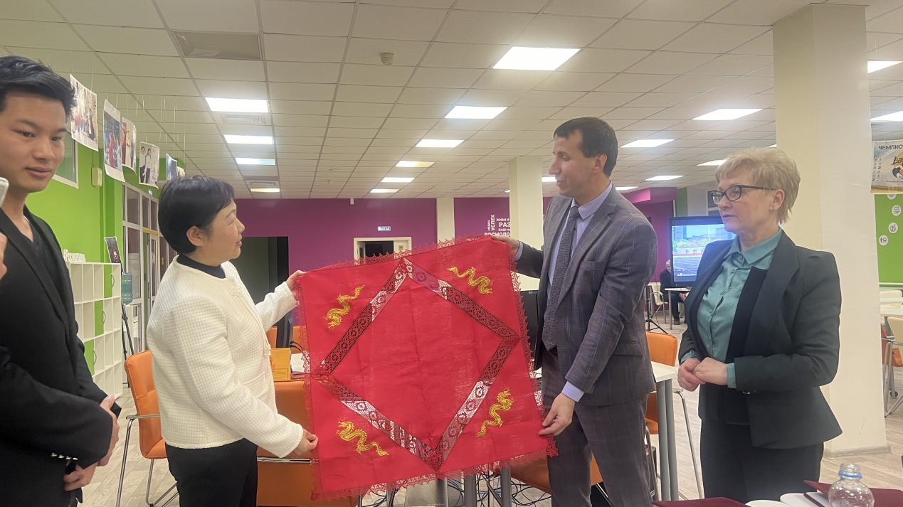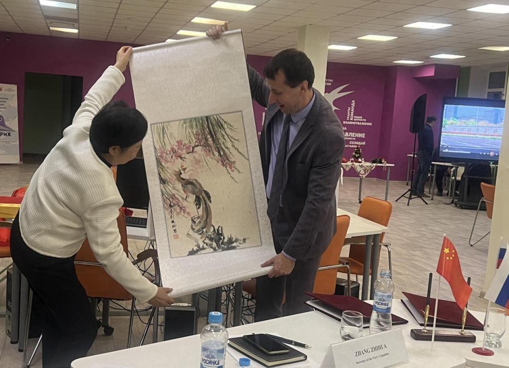 张志华向俄方大学赠送安徽省非物质文化遗产——凤画、凤阳花鼓