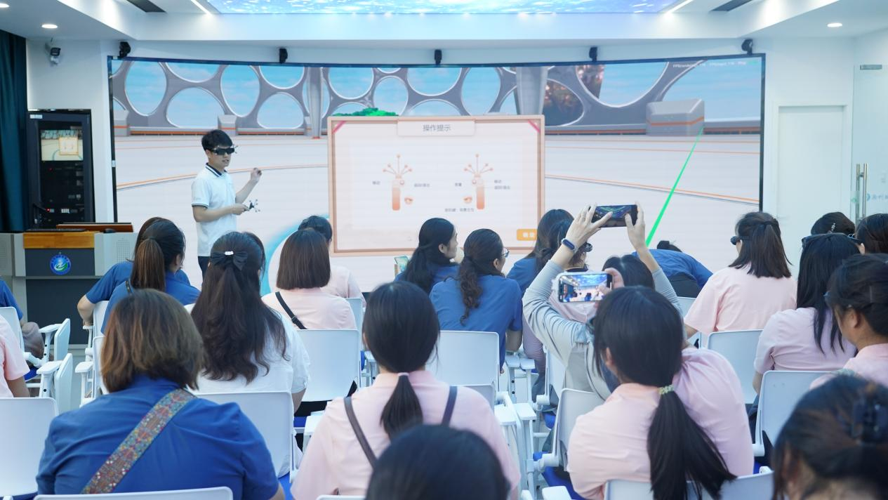随后,与会嘉宾参观教育学院省级学前教育虚拟仿真实训中心。数智研创中心张凯老师通过现场操作,带领与会嘉宾沉浸体验了虚拟仿真教学场景。